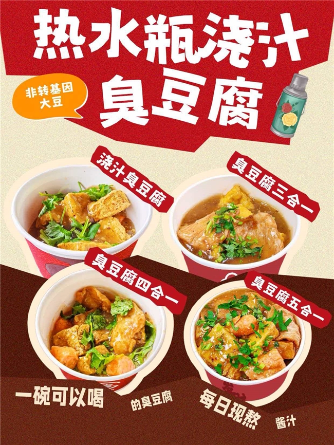 “热水瓶浇汁臭豆腐”的上线,更是进一步强化了晚间解压、夜宵下酒的场景。那股浓郁的卤香和极具辨识度的热水瓶造型,在夜市和社交媒体上自带流量光环。