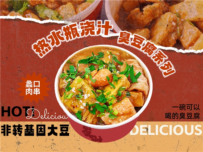 臭豆腐本身就是油炸小吃中的经典品类。蠡口肉串在传统基础上做了大胆创新:放弃传统的碗装带汤,改用极具潮流感的“热水瓶”装载秘制热卤汁。这既解决了产品久泡不脆的痛点,又把食用体验变成了社交传播的素材。基于已有的油炸设备体系和撒料调味经验,蠡口肉串品牌切入“浇汁臭豆腐”产品完全是降维打击。