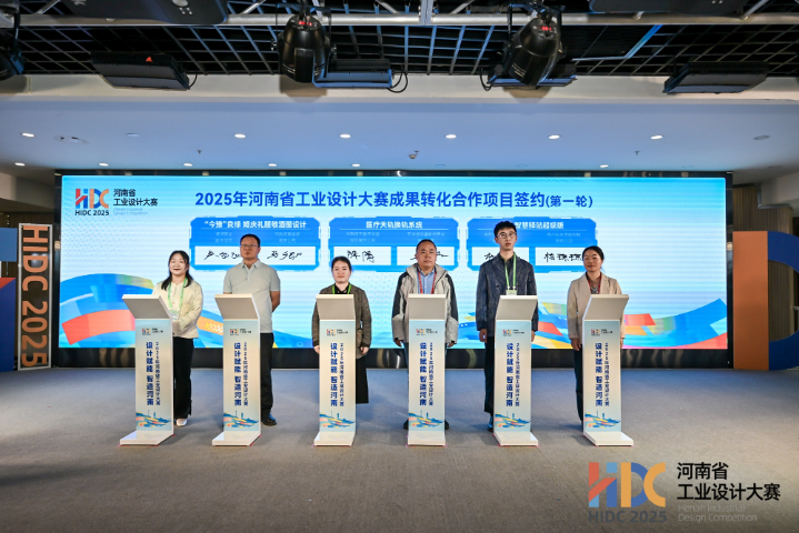 设计不应止于赛场,更要走向市场。本次活动上,一批大赛成果转化合作项目现场签约。其中,河南翔宇医疗设备股份有限公司“三维复合运动功能训练平台”“医疗天轨换轨系统”分别与河南省祥和康复研究院、天津捷创睿软件开发有限公司签约,郑州妙创工业设计有限公司“4000+PRO激光粒度仪”与郑州班艺智能科技有限公司签约,郑州沐客产品设计有限公司“真空淬火炉创新设计”与河南勇威特种设备有限公司签约。成都东造工业设计有限公司“城市智慧驿站超级版”与四川弘成昱皓科技有限公司签约;漯河职业技术学院“‘今豫’良缘婚庆礼服敬酒服设计”与河南源苒服装有限公司签约。