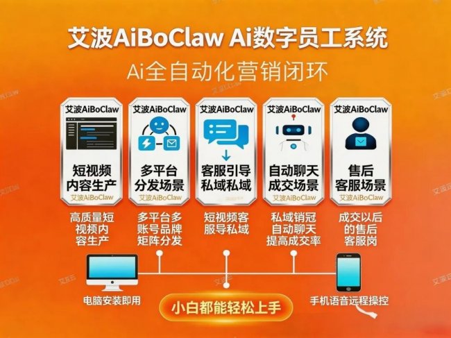 从视频内容生产到多平台分发,从私域客户维护到竞品流量抢占,从AI生态获客到数据化复盘,艾波AI员工覆盖运营全链路,以一台电脑的成本,实现一整个整合营销团队的工作效率!无需专业AI技术知识,无需复杂操作设置,只要一台联网电脑,就能成为企业的专属智能运营团队,让运营更高效、成本更低、转化更高!