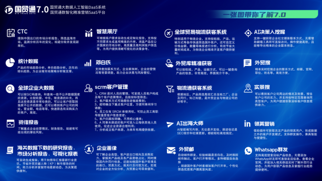 技术领先,操作便捷高效。国贸通深耕技术研发,拥有一支由400多位大数据、云计算、外贸研究专家组成的专业团队,构建了涵盖云存储、数据预处理、BI智能分析、大数据DT索引等核心技术的服务体系,累计沉淀27亿+条数据,支持19个检索条件,可一键生成406种二维统计报表,多维度呈现市场与客户信息。其7.0版本深度融合AI技术,可自动生成可视化报告、智能推送商机,即便外贸新人也能快速上手;系统支持不限设备、不限IP登录,海内外均有服务器,实现稳定秒查,彻底解决传统数据查询繁琐、效率低下的痛点。