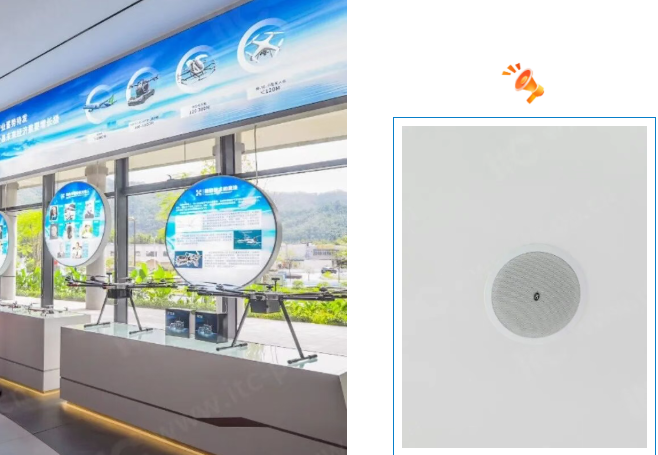 为精准匹配视觉呈现效果,itc在音频系统设计上采用了 吸顶音箱与数字合并式功放组合,实现了简洁布线与高品质音效的完美结合,无论是背景音乐播放还是现场讲解,都能清晰传达给每一位参观者。
