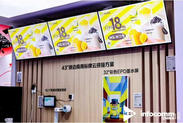 AOC聚焦高端餐茶饮门店的运营效率,提供“硬件+系统”一体化方案。展品涵盖43英寸微边商用标牌、23.8英寸桌面吧台屏、32:9超宽菜单屏、64英寸立式全面屏、食品效期管理屏及热敏标签打印机。