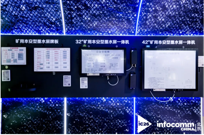 针对矿业场景的特殊安全需求,AOC展出的矿用本安型墨水屏一体机及牌板成为智慧矿山展区最受关注的创新产品。两款产品专为煤矿井下复杂高危环境研发,在潮湿、多尘、易爆条件下仍能稳定运行,具备清晰显示与超低功耗特点,彻底告别传统纸质牌板频繁更换、易污损、信息滞后等问题,可灵活悬挂或嵌入井下巷道壁、工作面等位置,有效解决行业多年的安全痛点。55英寸矿用本安型显示一体机作为井下“指挥中枢”,可实时显示生产数据与安全监测画面,支持音视频通话,实现井上与井下实时联动,大幅提升安全生产调度效率。该产品搭载煤矿井下标准化智能牌板系统,实现安全管理的高效闭环控制,全方位守护矿山作业安全。