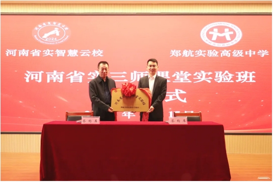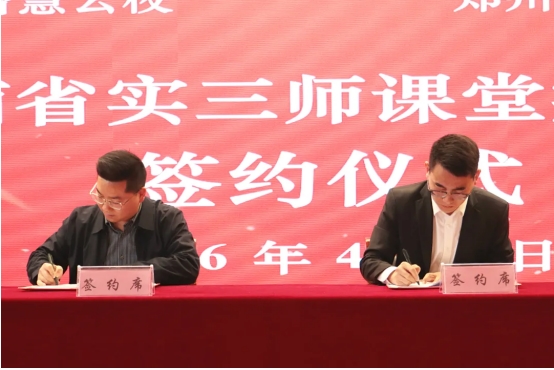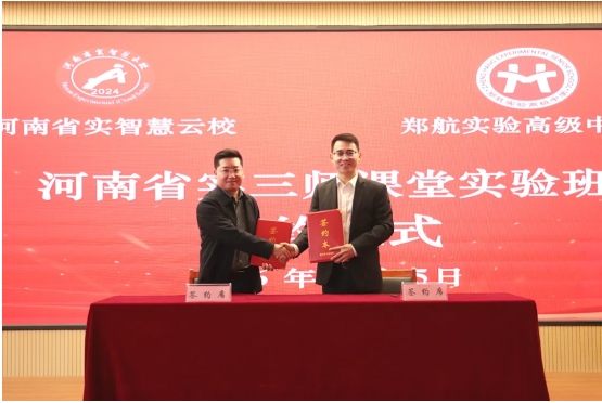 我校与河南省实智慧云校正式达成合作,校长王洋洋与河南省实智慧云校执行校长王显勇共同签署《郑航实验高级中学全日制同步三师课堂实验班提升服务》合作协议。