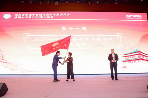 会议尾声,举行了简短的会旗交接仪式。渭南市第二医院代表从本届承办方手中接过旗帜,成为下一届年会的承办单位,标志着陕西眼视光学界的学术接力棒薪火相传,生生不息。