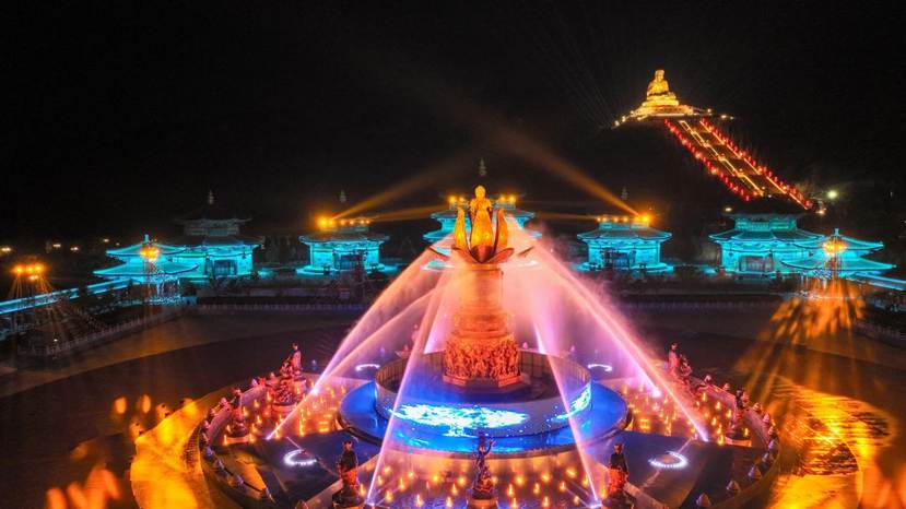 19:00,华严世界灯光水秀梦幻回归,流光与水幕共舞,为这一天的庆典画上圆满句号。