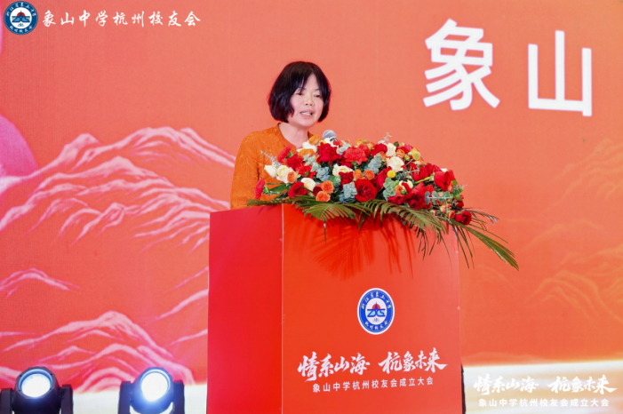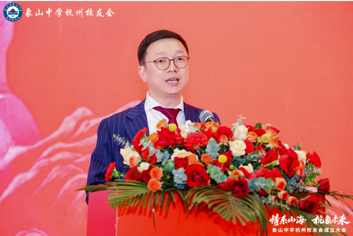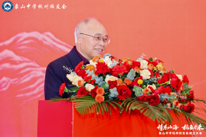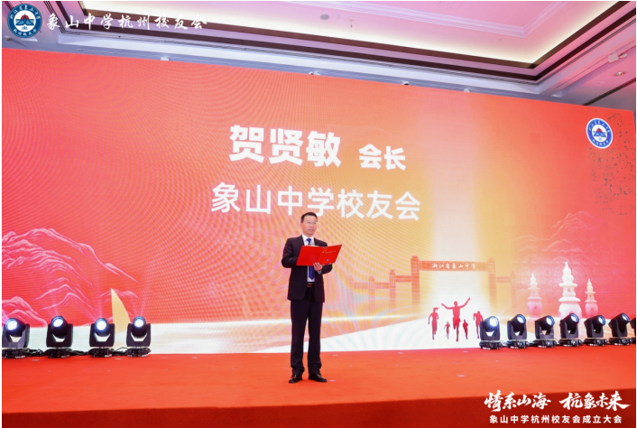 象山中学校友总会会长、象山中学党委书记、校长贺贤敏致辞。他深情回顾了母校八十余载栉风沐雨、薪火相传的发展历程,阐释了校友会作为"象中人精神家园"的核心意义,并现场宣读杭州校友会成立批复,正式宣告象山中学杭州校友会获准成立。