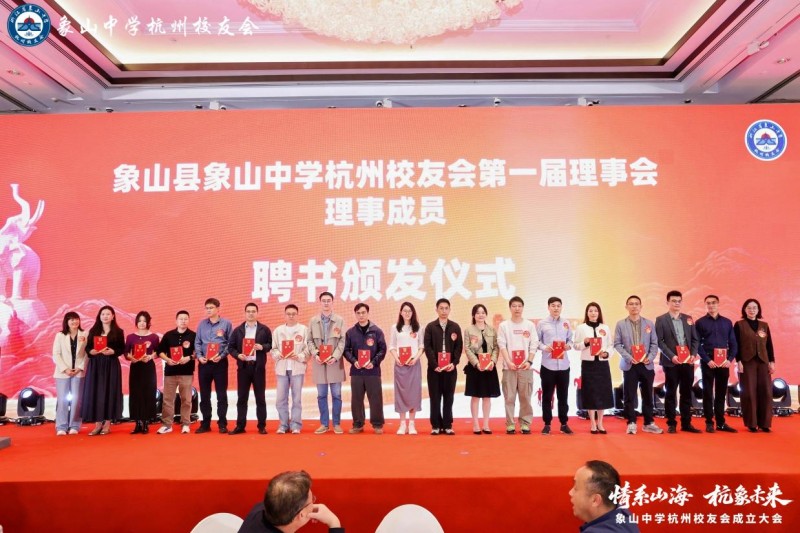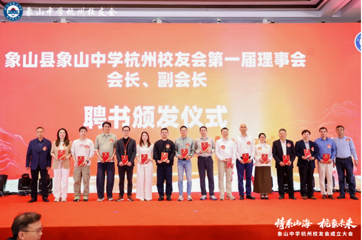 成立大会上,现场播放了各地校友分会及海内外校友发来的祝贺视频与贺信,传递着各方对杭州校友会的美好祝愿,也彰显了象中校友大家庭的温暖与凝聚力。主持人宣读第一届理事会名单,并举行授牌与颁证仪式——一块牌匾,承载着联结校友、回馈母校的责任与使命;一份聘书,寄托着全体校友的信任与期许。
