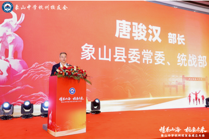 象山县委常委、统战部部长唐骏汉及家乡相关部门负责人出席会议并致辞,向与会校友致以诚挚祝贺。会上,唐骏汉详细介绍了近年来象山经济社会发展取得的显著成就和优越的投资环境,并热忱欢迎象山中学在杭校友常回家看看,共叙乡情、共谋发展。
