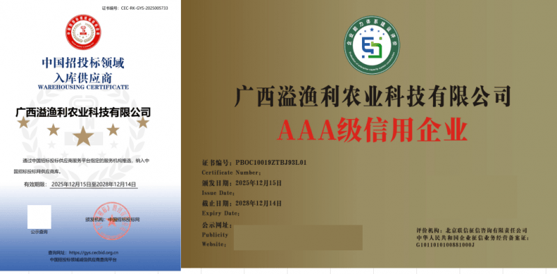 2025 年 12 月 15 日,深耕农业科技领域 8 年的广西溢渔利农业科技有限公司(以下简称 “广西溢渔利农业”)迎来发展里程碑 —— 经北京联信征信咨询有限责任公司严格评审,一举斩获 AAA 级信用企业、AAA 级诚信经营示范单位等多项权威认证;同日,公司通过中国招标投标供应商服务平台推选,成功纳入中国招标投标网供应商库。所有荣誉均于当日生效,有效期至 2028 年 12 月 14 日。作为 2017 年成立的农业科技企业,公司以 “科技创新、绿色发展、服务三农” 为理念,此次双重认可为其推动农业现代化、助力乡村振兴注入强劲信用背书。