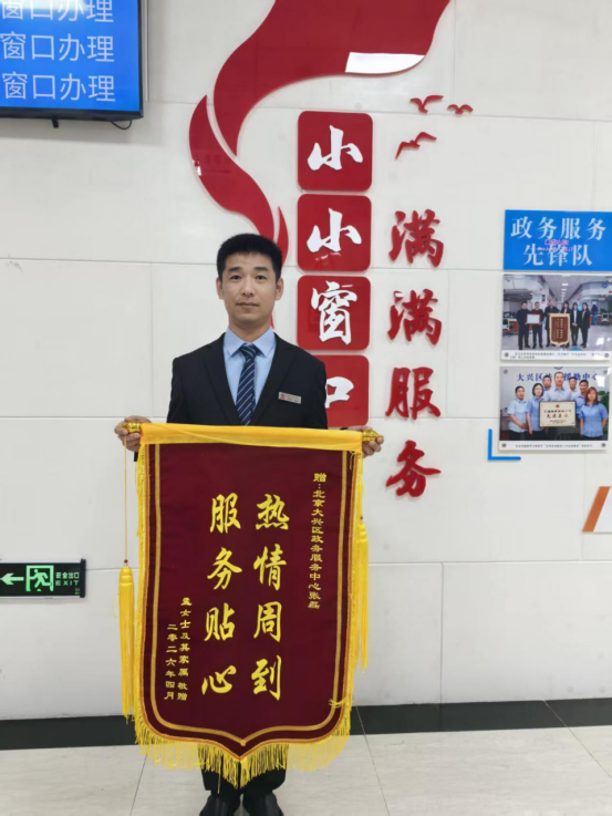 一面锦旗,映照为民初心;一声感谢,见证服务温度。近日,市民孟女士携家属专程来到大兴区政务服务中心,将一面锦旗送到窗口工作人员张磊手中,对其在小客车指标转移业务中的专业指导和贴心服务表达诚挚谢意。“小客车转移手续复杂,多亏窗口小伙子耐心讲解,顺利办成了,真是省心又暖心!”