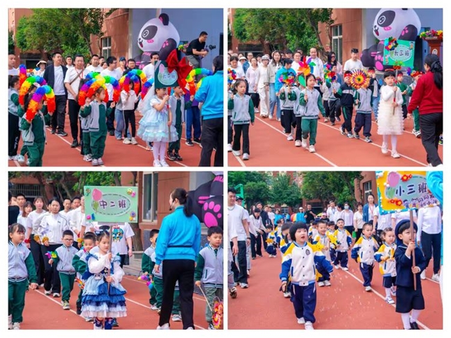 各班方阵特色鲜明:大班以“进取”“阳光”“坚韧”为关键词,步伐坚定;中班展现“自信”“热情”“朝气”,活力四射;小班萌娃虽步履稚嫩,却以“童真”“欢乐”“团结”传递温馨童趣。