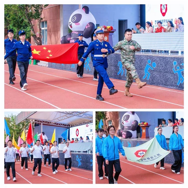伴随着激昂的乐曲,运动会入场仪式正式开始。由家长代表组成的国旗班步履铿锵,五星红旗庄严闪耀,家国情怀在心中激荡;园旗方阵迎风舒展,石榴花开象征着团结融合,生动诠释五融五育育人初心,引领家园携手共赴美好;家长组成的彩旗方阵绚烂飞扬,五彩飘扬,寓意着童年多彩向阳、活力无限。