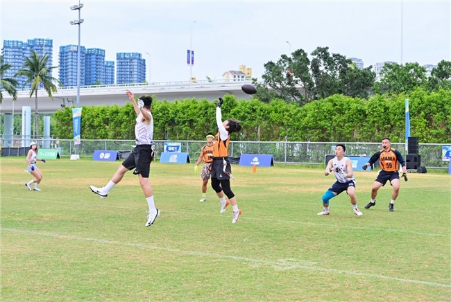 腰旗橄榄球公开赛在海口世纪公园滨海草坪同步举行。赛场上,选手们身手敏捷、战术多变——快速变向、精准传接、瞬间摘旗,每一次攻防转换都扣人心弦。碧海蓝天、绿意草坪与奔跑的身影构成了一幅充满活力的自贸港运动画卷。