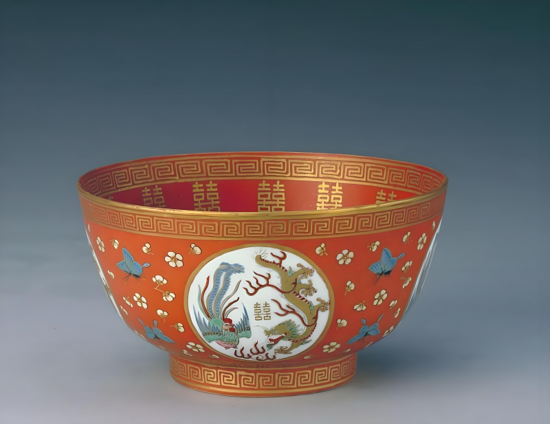 这件看似寻常的碗,实则非同寻常。它不是日常用器,而是一件承载礼制、寄托祝福的礼器。清代十二位帝王中,真正以帝王身份举行过大婚典礼的,仅有顺治、康熙、同治、光绪四位。同治大婚用瓷严格遵循宫廷礼仪制度制成,是帝王婚礼文化的重要载体,亦是晚清礼仪美学的缩影。这批瓷器历时数年赶制完成,品类繁多、数量巨大,将清代陶瓷装饰中“图必有意,意必吉祥”的特征发挥到了极致。