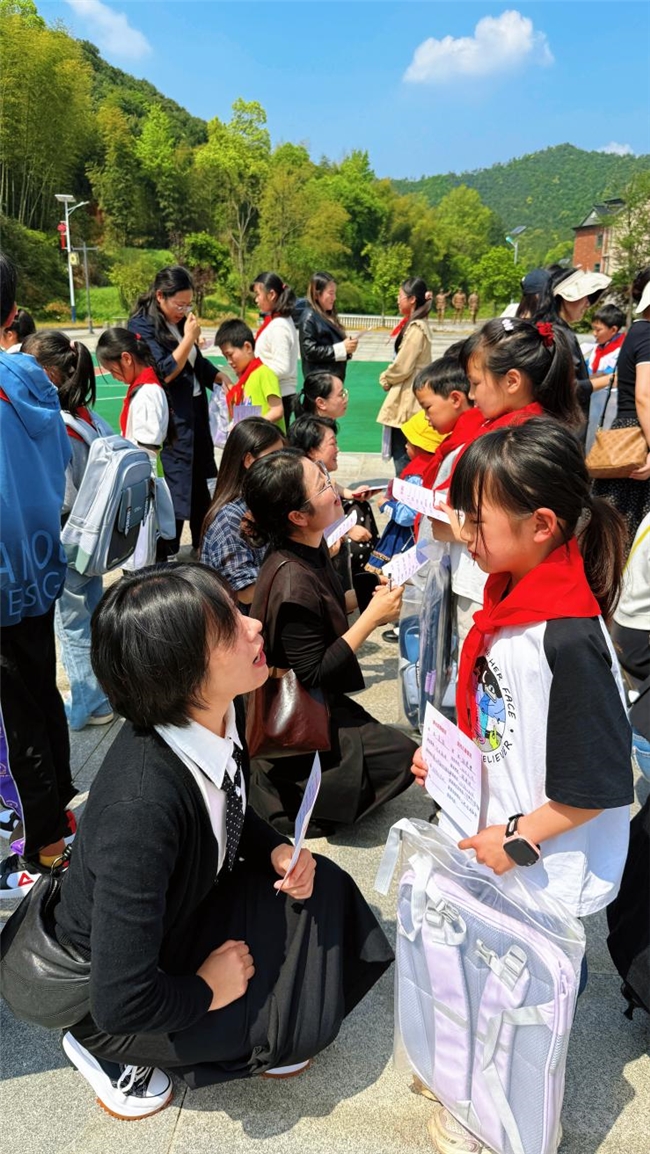 活动当天上午10点整,关爱帮扶活动正式启动。现场创新开展盲摸暖心结对,爱心妈妈们蒙眼牵手结对儿童,以指尖相触拉近心灵距离,温柔暖心的互动瞬间消除隔阂,迅速搭建起亲情陪伴桥梁。结对仪式现场温馨满满,爱心妈妈为孩子们精心送上崭新书包、文具等爱心物资,细致叮嘱日常学习生活。双方现场互换爱心结对卡,写下联系方式与暖心寄语,定格温暖瞬间,搭建长期沟通帮扶纽带,让亲情陪伴有依托、暖心关爱有落点。面对面谈心交流、贴心关怀陪伴,进一步筑牢情感联结,让孩子们真切感受到家人般的温暖。温情结对过后,爱心妈妈陪伴结对孩子共同亲手制作祭奠花篮,一针一线寄托哀思,一花一叶饱含敬意。大家整齐列队、肃立默哀、郑重宣誓,向革命先烈李新汉敬献花篮,缅怀英雄事迹,传承红色精神。