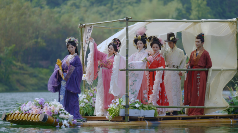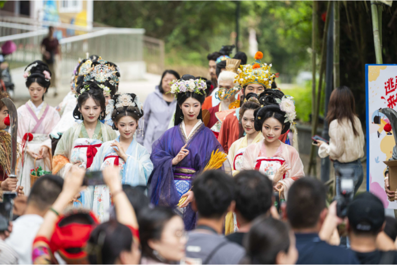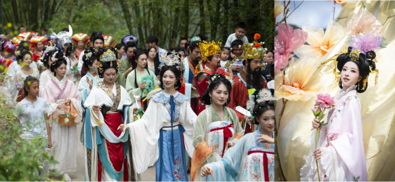 每一位游客在踏入南天门的那一刻,便犹如加入“仙籍”“步入仙境”。远处山峦叠翠,碧水环绕,近处国风音乐袅袅,空气中弥漫着淡淡的草木清香与节庆的喜悦。龙江第一湾的绝美山水中,壮族创世女神姆洛甲的传说被生动演绎。一位由专业演员扮演的姆洛甲女神,身着紫衣盛装,手持象征生命与繁衍的麦穗,带领男女各十二位花神,向围观的游客进行“赐花祈福”。这一互动环节让深厚的壮族历史文化变得可触可感。