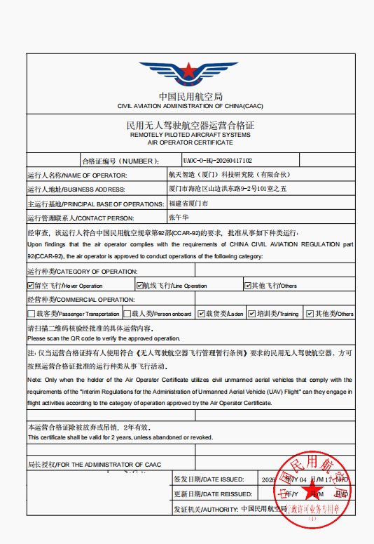 近日,航天智造(厦门)科技研究院(有限合伙)正式获颁中国民用航空局民用无人驾驶航空器运营合格证(合格证编号:UAOC-O-HQ-20260417102),标志着研究院在无人机合规运营、安全管控与商业化落地方面迈入全新阶段,成功拿下国内无人机商业运行领域权威准入资质。