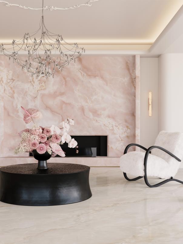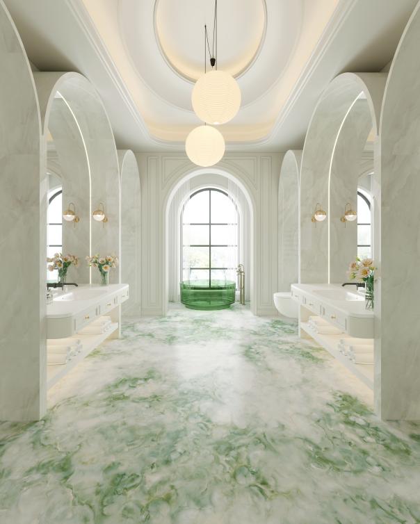 产品采用独家玉脂肌肤釉工艺,搭配变晶墨水技术,砖面透感较同类产品提升30%,触手温润细腻,打破传统瓷砖冰冷的固有印象。