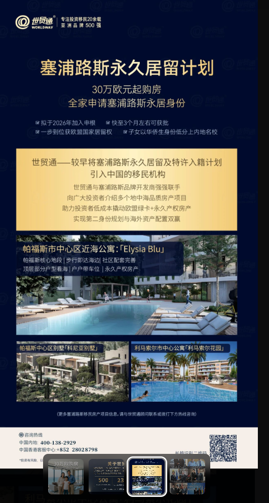 对于有欧洲身份配置需求的家庭而言,越早开始了解和规划,往往越能为未来争取更多选择余地。目前,投资30万欧元起购房,可全家申请塞浦路斯永居身份。作为欧盟成员国,塞浦路斯正在积极申请加入申根区,并已进入冲刺阶段。一旦成功,塞浦路斯永居卡持有者将能免签自由通行29个申根国家,真正实现欧洲无边界畅行。