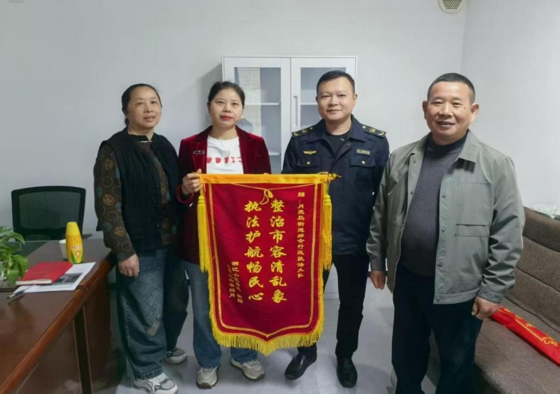 4月21日,银星村湘江小区居民代表手持一面写有“整治市容清乱象,执法护航畅民意”的锦旗来到月亮岛街道综合行政执法大队,致以最诚挚的感谢。