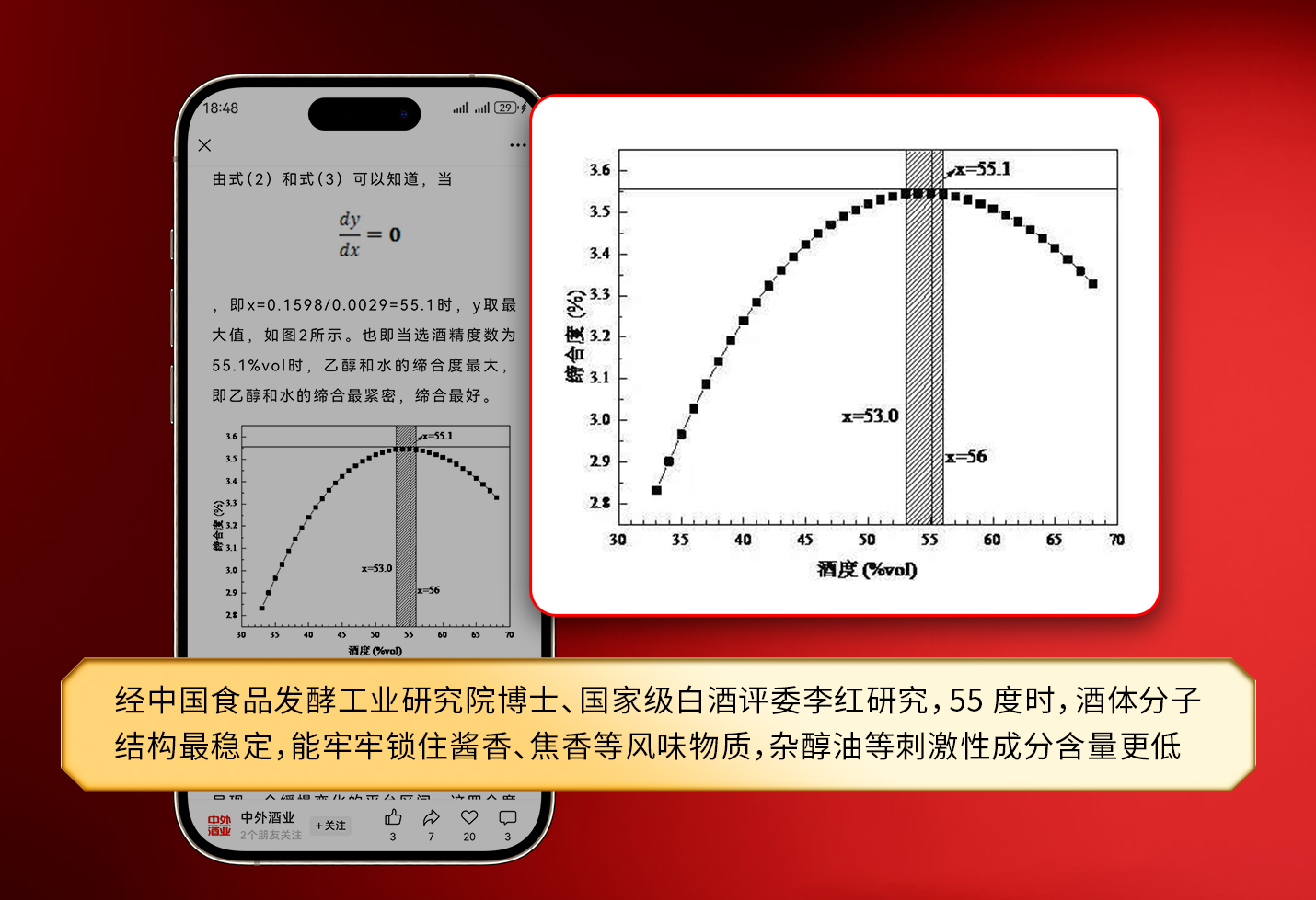 经中国食品发酵工业研究院博士、国家级白酒评委李红研究证实,55.1度为乙醇与水分子最优缔合度数。此度数下酒体分子结构稳定,能够牢牢锁住酱香、焦香等风味物质,同时降低杂醇油等刺激性成分,入口柔顺、饮后舒适。