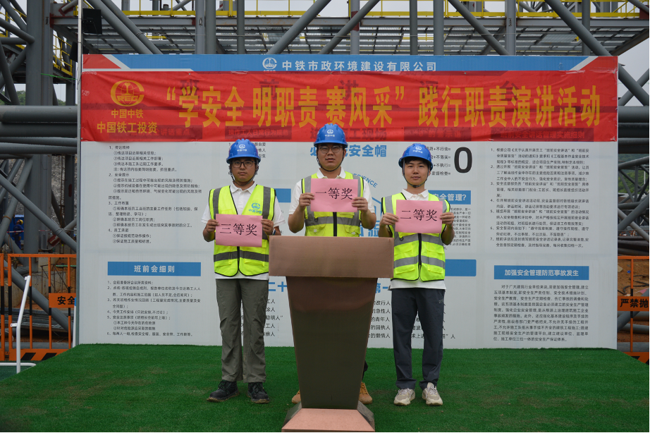 活动现场氛围热烈非凡,施工机械的轰鸣声与现场的掌声、欢呼声交相辉映,背景板上“学安全,明职责,赛风采”九个大字格外醒目,与身着工装、精神抖擞的参赛选手们相映成趣,构成了施工现场一道独特的风景线。参赛选手们来自项目各个岗位,有一线施工人员、安全管理人员、技术骨干,他们带着满满的自信脱稿演讲,带着对安全工作的深刻感悟,依次登台亮相,展现出新时代中铁项目建设者的责任与风采。