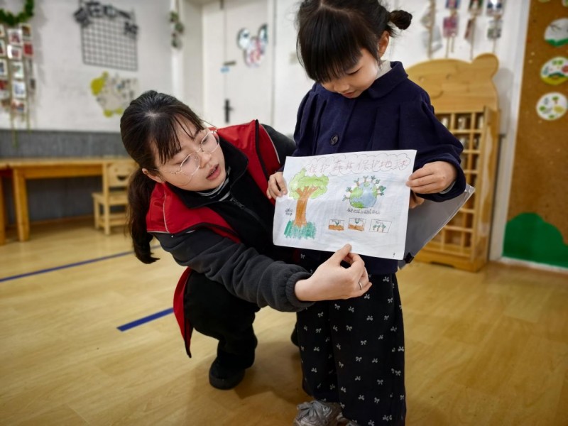 宣讲结束后,进入期待已久的手抄报创作环节。在学生志愿者和幼儿园老师的耐心指导下,孩子们拿起彩笔、画纸,尽情发挥创意,用五彩斑斓的画笔描绘心中的“美丽地球”:翠绿的森林、清澈的河流、可爱的小动物、暖心的环保标语……一幅幅充满童真与爱意的作品跃然纸上。志愿者们一对一陪伴指导,帮助孩子们完善细节,记录下这份独属于童年的环保心愿。
