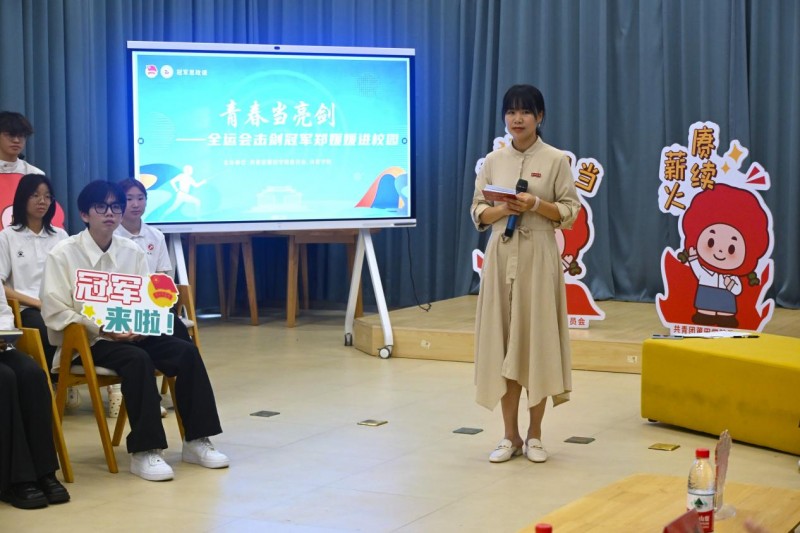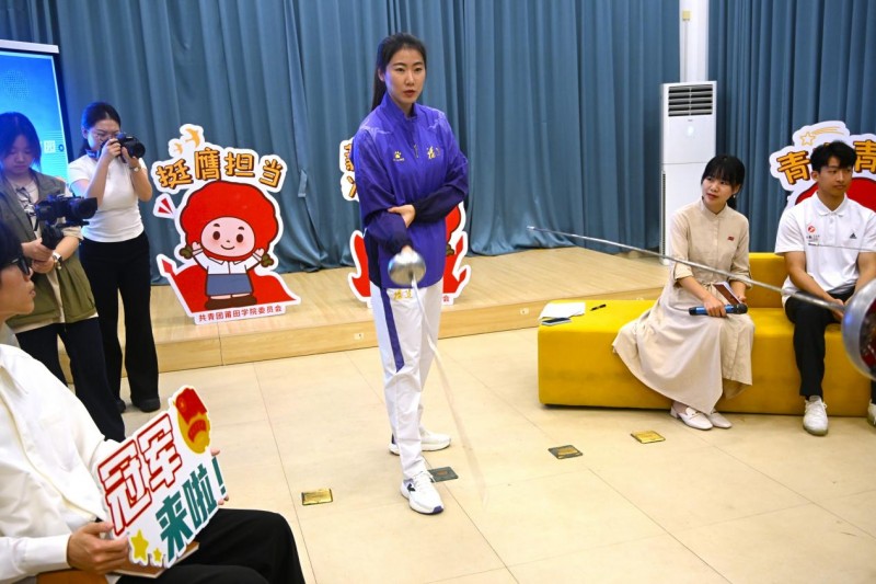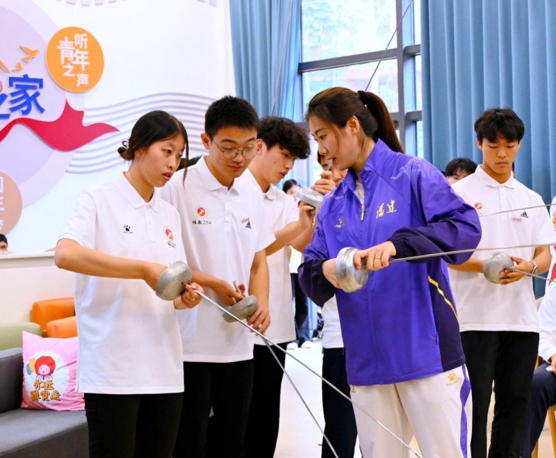 面对面访谈中,师生围绕“体育精神与青年成长”“冠军眼中的新时代青年”等话题与郑媛媛深入交流。当被问及“如何面对训练中的枯燥与重复”时,她笑着回答:“每天几百次出剑、几千次步伐移动,确实枯燥。但当你把每一剑都当作比赛中的最后一剑,枯燥就变成了积累。没有白流的汗,也没有白出的剑,每一次努力都有意义。”