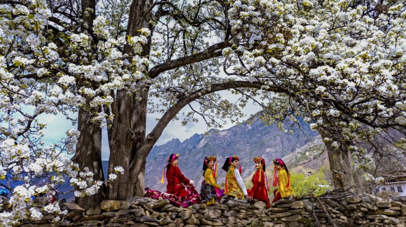 丹巴姑娘与梨花相映成趣 摄影 用旦