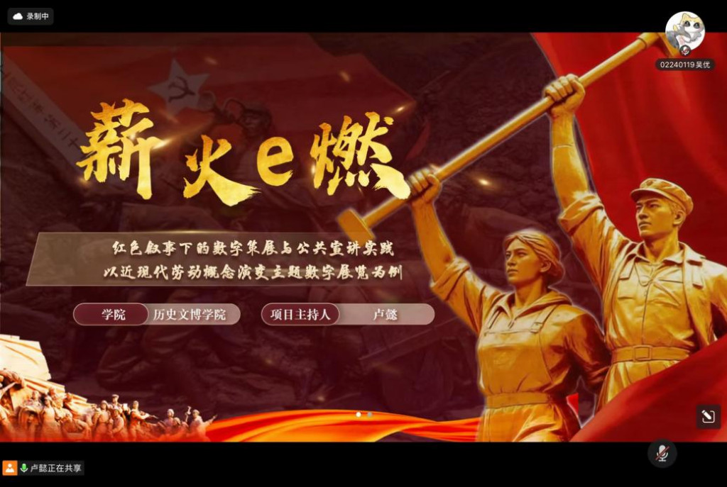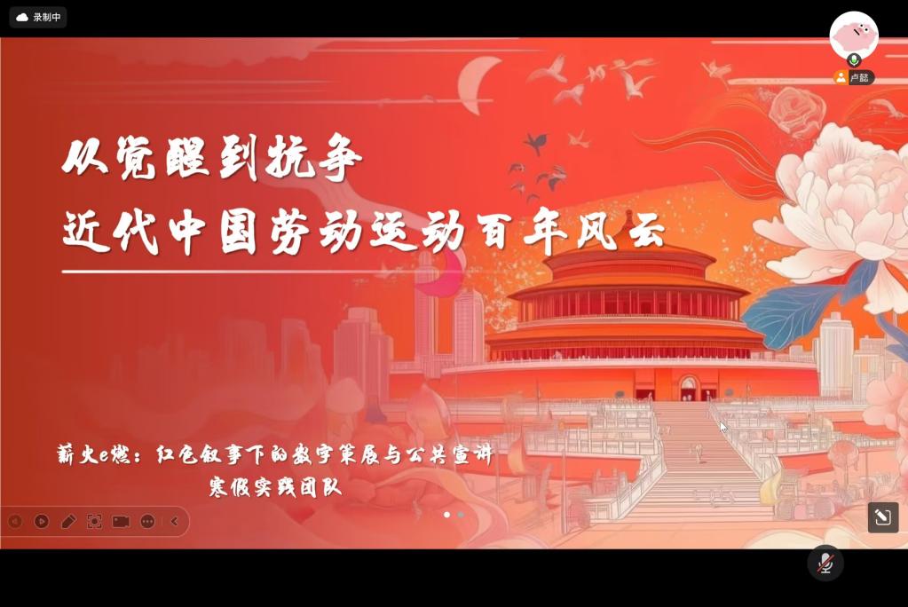 为进一步扩大红色文化影响力,团队先后开展两场线上公共宣讲活动。2月24日,首场宣讲以“数字赋能红韵,青春宣讲传薪”为主题,向听众展示青年如何运用数字技术赋能红色文化传播。2月27日,第二场宣讲聚焦“从觉醒到抗争——近代中国劳动运动百年风云”,将调研中的鲜活案例与数字展览内容有机结合,让劳动精神更加可感可触。宣讲团队以调研成果与数字展览为支撑,采用直播、录播等形式,面向高校学生与中学生群体讲述红色故事、阐释精神内涵。过程中注重互动交流,与数字展览有机联动,引导受众云端观展、沉浸式学史,推动红色文化从被动观看向主动传播转变。