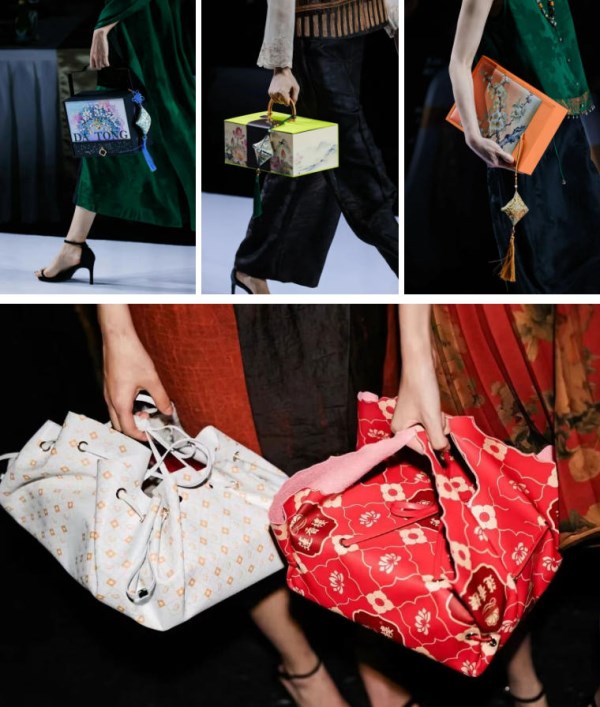 作为重磅发布,中国服装设计最高荣誉金顶奖获得者李小燕联手唐贤香云纱,以岭南百年老品牌莲香楼、惠如楼为文化根脉,以非遗香云纱为材质语言,将广府饮食文脉与东方高定美学相融,呈现一场关于岁月、匠心与生活的时装叙事;霆禧品牌则取东方山水莲荷、传统祥瑞纹样为创作灵感,糅合广绣、织锦等古法手工技艺,将中式立领、盘扣、对襟等经典形制,解构重塑为适配当代审美的宽松利落剪裁,表达老字号与时尚碰撞的当代新生与文化传承;广绣代表传承人唐晓玲将广绣非遗技艺与国潮美学相融,以水墨荷花、粤剧冠饰、桃枝刺绣为设计语言,为大家呈上了莲香楼「花开见月」、大同酒家「戏韵秋华」、惠如楼「桃枝凝香」等三款礼盒,让中秋心意长久留存;国家一级皮具师、广东纺织服装非遗推广大使林俊亿设计的三款包袋,兼顾物流效率与环保理念,惠如楼借镬耳屋塑形,莲香楼以金绳莲叶、红绳莲花点睛,让非遗皮具走入日常,以时尚焕新老字号品牌。