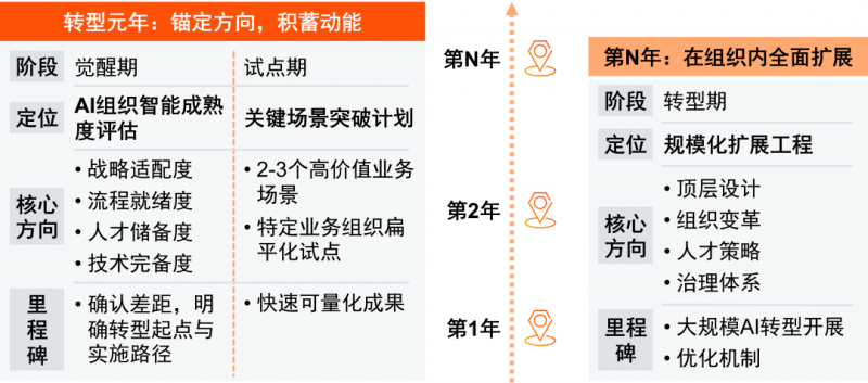 第二阶段开展“关键场景突破计划”,选取2-3个高价值业务场景(如IT研发流程再造或客服实时响应体系),在6-8周内完成从流程重塑、技术部署到运营优化的全周期验证,为执行AI落地的场景快速形成可量化成果。