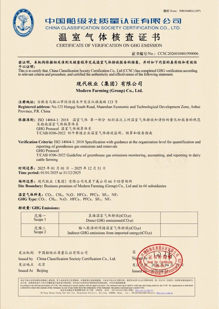 2025年,全球温室气体核查标准迎来全面升级,碳排放边界的划定、数据颗粒度的要求显著提升。面对更为严苛的准入门槛,现代牧业成功一次性通过了ISO14064-1及GHG Protocol温室气体核算体系认证。目前,现代牧业已连续五年获得范围一、范围二认证,连续三年获得范围三全类别认证,标志着低碳管理已从“应对考核的加分项”转变为可持续发展的“硬核基本功”。
