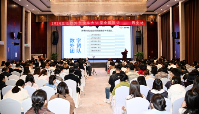 4月24日下午,由杭州思亿欧集团举办的2026外贸快车外贸大讲堂首站【西安站】,在西安市开元名都大酒店圆满落幕。这场纯公益性质的外贸知识盛宴,吸引了600余家西安外贸企业代表齐聚一堂,共探 AI 时代外贸营销新路径。思亿欧高级副总裁徐苏源、思亿欧外贸快车西北大区渠道总监俞启程、思亿欧外贸快车西安负责人严家德及西安分公司全体成员也出席了本次活动。