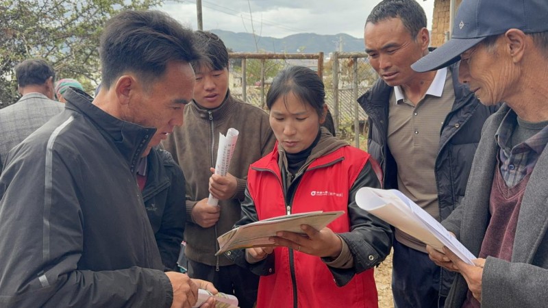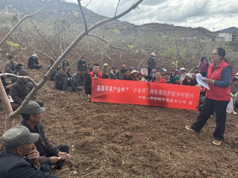2026年4月2日,中国人寿财险宁蒗县支公司工作人员在宁蒗彝族自治县新营盘乡为果农讲解特色苹果种植保险方案。(受访者供图)
