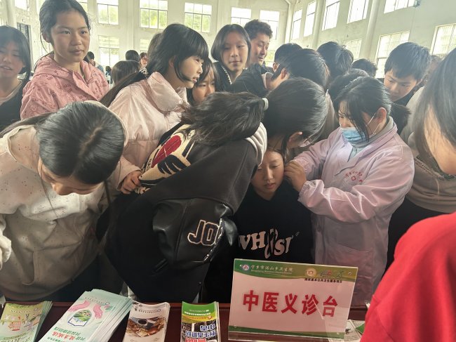 除了知识宣讲,现场还设置了义诊和健康咨询区,尤其是中医服务备受青睐。中医医务人员为师生提供了耳穴压豆等特色体验,不少学生排队参与,切身感受中医药文化的独特魅力。同时,针对学生提出的常见健康问题,医务人员逐一耐心解答,提供专业建议。“今天学到了很多有用的健康知识,回去后我也要讲给家人听!”活动中,学生们纷纷表示收获颇丰。整场活动内容丰富、形式活泼,既有知识传递,又有互动体验,营造了“师生齐参与、健康共守护”的良好氛围。