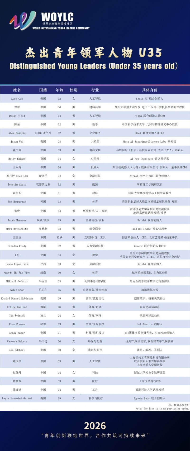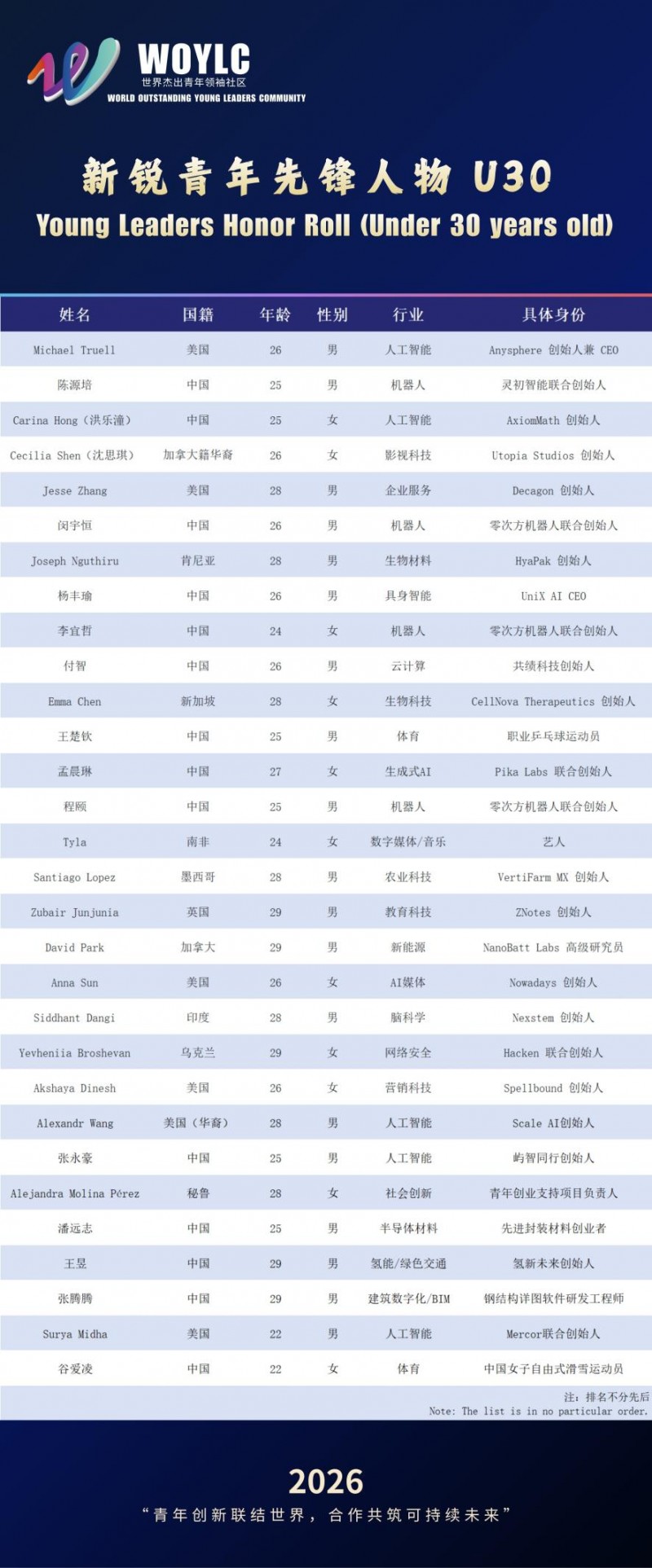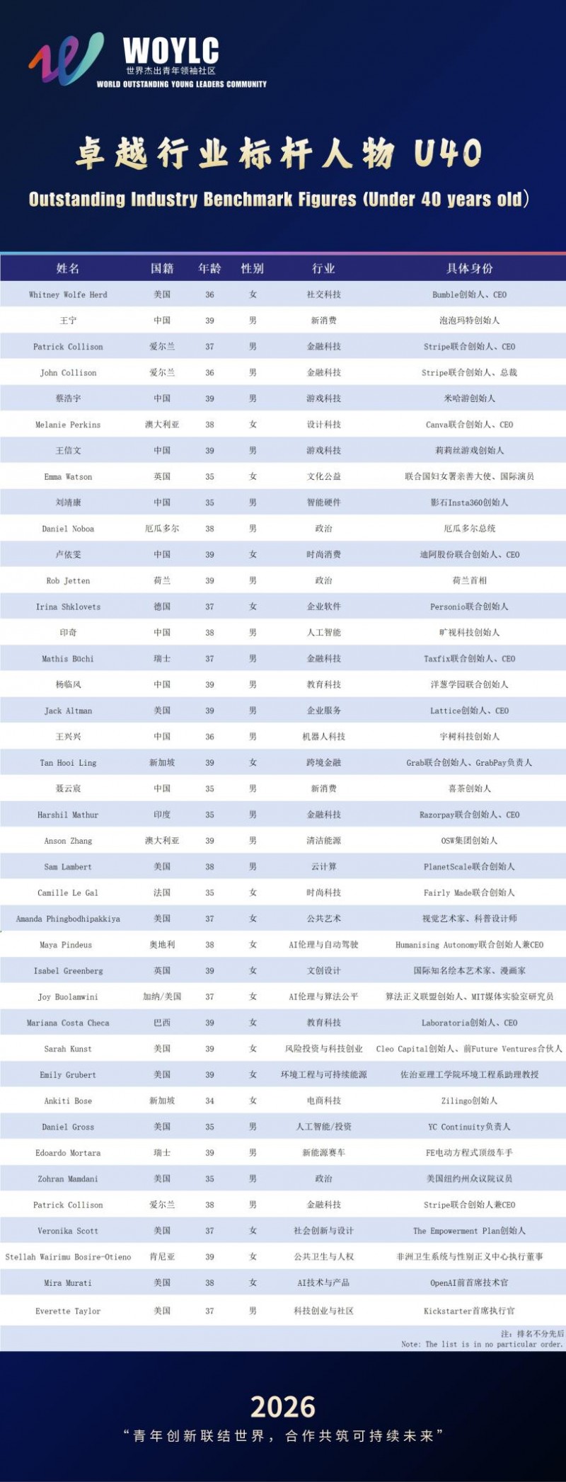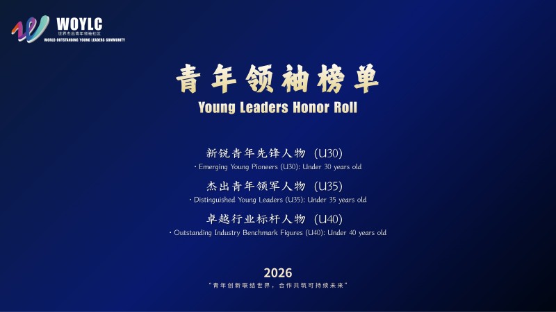 WOYLC作为全球青年领袖链接平台,以“激发青年潜力、凝聚全球共识”为核心使命,立足全球可持续发展对多元青年力量的需求,结合青年成长阶段特征,重磅推出 「新锐青年先锋人物(U30)」「杰出青年领军人物(U35)」「卓越行业标杆人物(U40)」 三大梯度榜单,分别覆盖30岁、35岁、40岁以下青年群体,构建起“发掘-赋能-引领”的全周期支持体系。