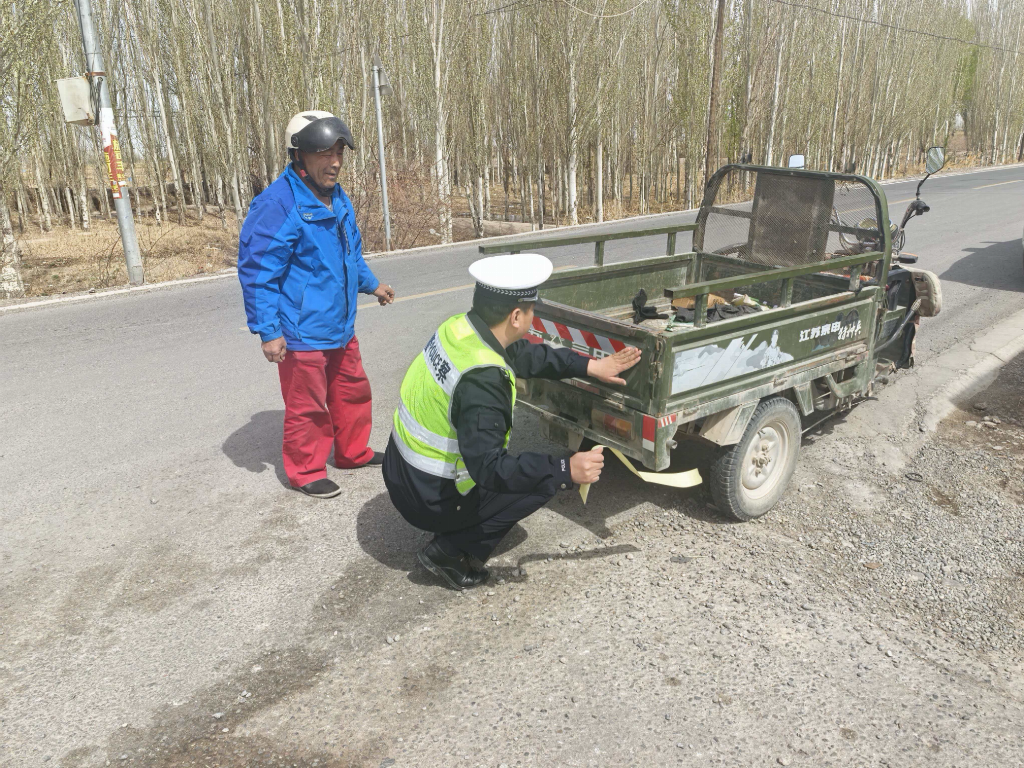一、全面排查摸底,精准掌握车辆底数。民辅警以辖区村组、集市、加油站周边等三轮车高频通行区域为重点,开展拉网式排查走访。对过往三轮电动车逐一检查,重点排查车辆无反光标识、反光条破损脱落、车况不佳等安全隐患,详细登记车辆信息、车主联系方式,建立隐患台账,做到底数清、情况明、全覆盖、无遗漏,为后续精准开展反光条粘贴工作奠定坚实基础。