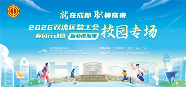 2026年4月23日下午,由成都市双流区总工会、成都市双流区人力资源和社会保障局联合主办的“就在成都 职等你来”2026年“春风行动”暨就业援助季校园专场招聘会在成都信息工程大学(航空港校区)体育馆广场成功举办。