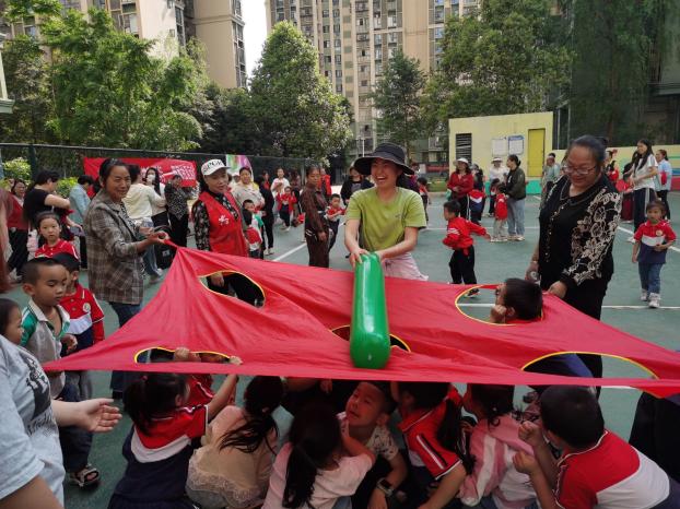 巨大的彩虹伞铺展开来,家长们拉着伞边上下起伏,孩子们则化身机灵的“小地鼠”在伞下钻来钻去。音乐突然一停,“地鼠”们慌忙躲避,生怕被彩虹伞“盖住”。有的孩子钻得太慢被“抓”个正着,现场笑声一浪高过一浪。