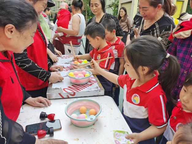 投壶区,爸爸手把手教孩子瞄准壶口,一支竹箭“铛”地落入壶中,小朋友兴奋得跳起来;丢沙包区,妈妈示范投掷姿势,孩子用力一抛,正中靶心;夹彩球区最考验精细动作,只见小选手们屏住呼吸,用筷子稳稳夹起彩色小球,一颗、两颗……全部送入指定容器,成功通关!