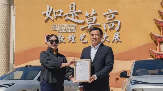 仪式上,一辆身披敦煌艺术定制车贴的专属展示车辆格外吸睛,九色鹿灵动跃然,成为一道独具文脉气息的亮眼景致。