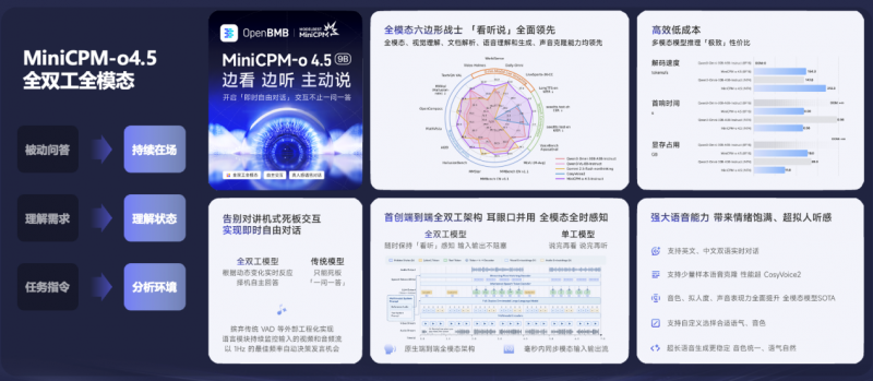 随着面壁智能最新发布的 MiniCPM-o 4.5 全模态模型的成熟,SuperMate 将进一步引入全模态交互能力。该模型具备原生全双工交互能力——在输出时仍能持续感知视觉与听觉输入,无需等待用户说完即可自主判断交互时机。这意味着座舱 AI 将不再是"一问一答"的回合制对话,而是能够像一个始终在线的副驾一样,边听、边看、边主动回应。