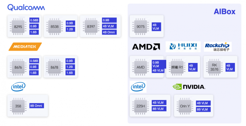 全场景 Agent 能力的落地和全模态交互的持续演进,都需要强大且灵活的算力底座来支撑。而端侧 AI 要真正规模化上车,必须适应不同车型、不同芯片、不同成本结构的现实约束。SuperMate 已完成对高通、联发科、英特尔、瑞芯微、英伟达、AMD等主流芯片平台的全面适配,支持从轻量语音交互到全模态理解的多规格模型灵活运行,兼顾性能、成本与功耗,满足量产车型不同配置梯度的需求。面壁智能与各芯片厂商及座舱产业链上下游伙伴保持紧密合作,通过软硬一体的联合研发推动 AI Box 等端侧算力产品的落地。