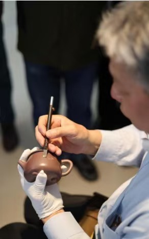 启幕仪式上徐世昌先生现场展示了其“空刀”技法——以刀代笔,以壶当纸,一气呵成。纵观本次展览,其主题不仅是一场关于水墨、陶瓷与紫砂的视觉盛宴,更是泾县深化“微笑泾县 宠你千遍”城市文旅品牌,以艺术展览丰富假期旅游市场、推动非遗创造性转化的重要举措。
