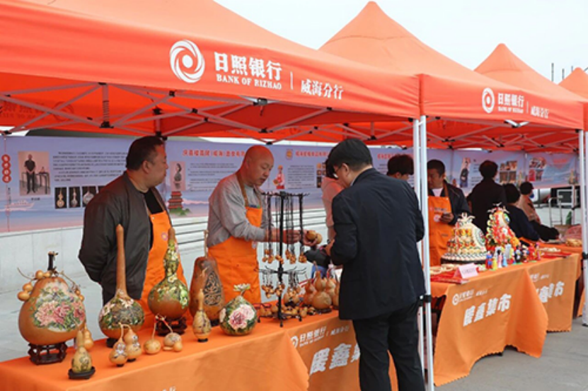 依托威海丰富的旅游资源和非遗文化底蕴,日照银行威海分行邀约了部分威海市旅游商品大赛的获奖商家入驻,打造了由特色摊位组成的“暖鑫集市”。威海姜不老集团、星耀食品、胶东大饽饽等本土知名企业携旅游食品、农特产品、非遗工艺品等集中亮相。