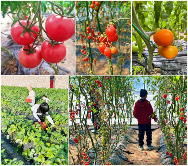 塔元庄同福园西区四季采摘园占地约1000亩,建有100余栋高标准大棚,全程采用生物有机菌肥改良土壤,种植的草莓、番茄、火龙果、黄瓜等特色果蔬,生态绿色、营养健康。通过科学品种搭配,园区真正实现“季季有新品、四季可采摘”,“五一”期间,新鲜果蔬正迎来采收旺季,游客可亲手采摘、现摘现吃,沉浸式感受农耕劳作的喜悦与田园生活的惬意。