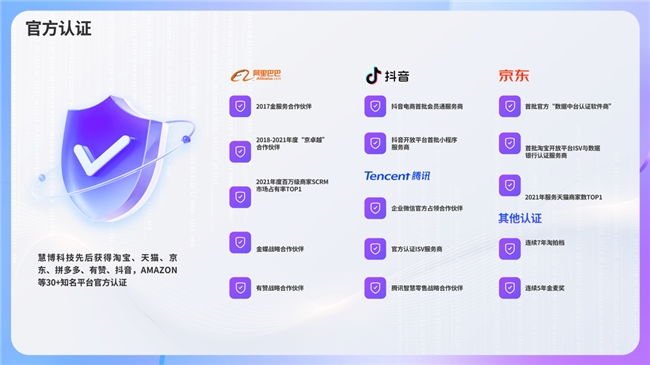 慧博会员通已完成淘宝、天猫、京东、抖音、视频号、快手、唯品会等 30 + 主流电商与内容平台官方认证打通,是业内覆盖渠道广、落地经验丰富的全域会员运营服务商。
